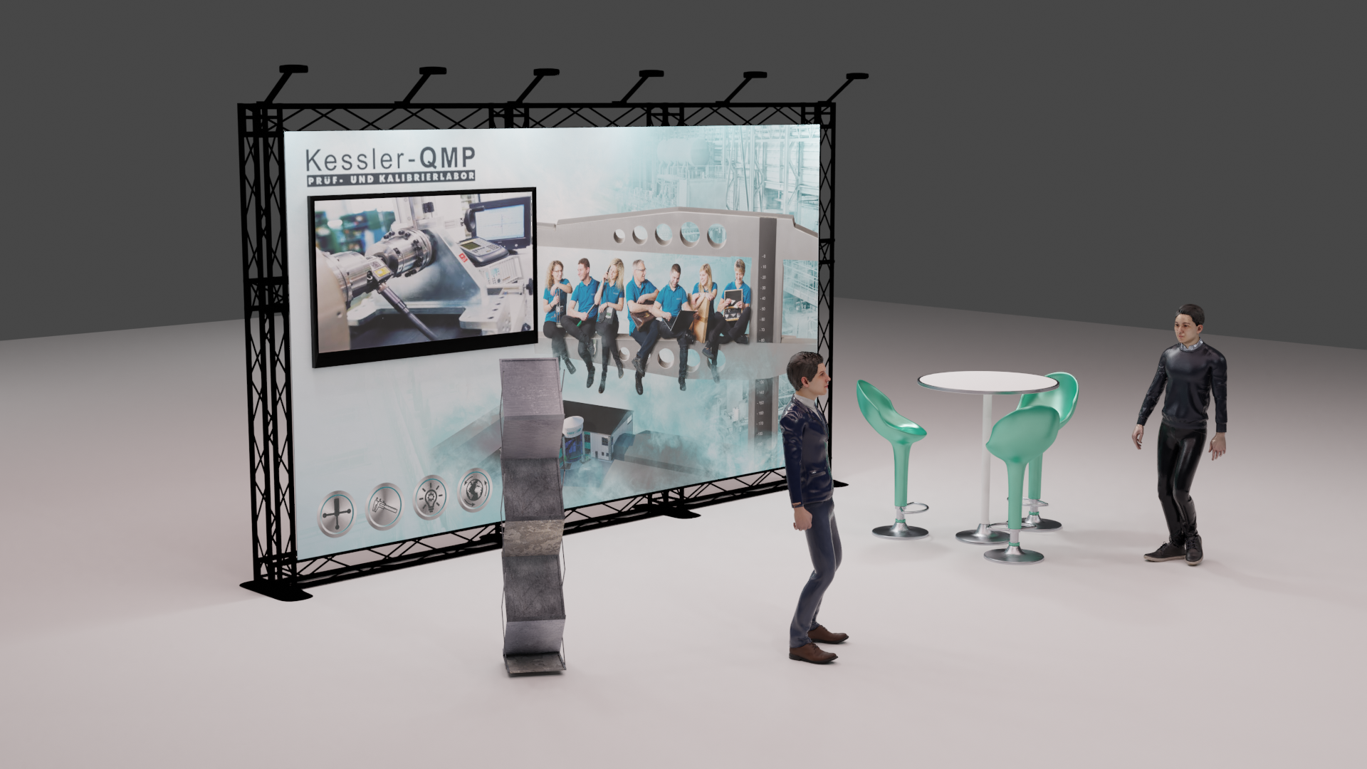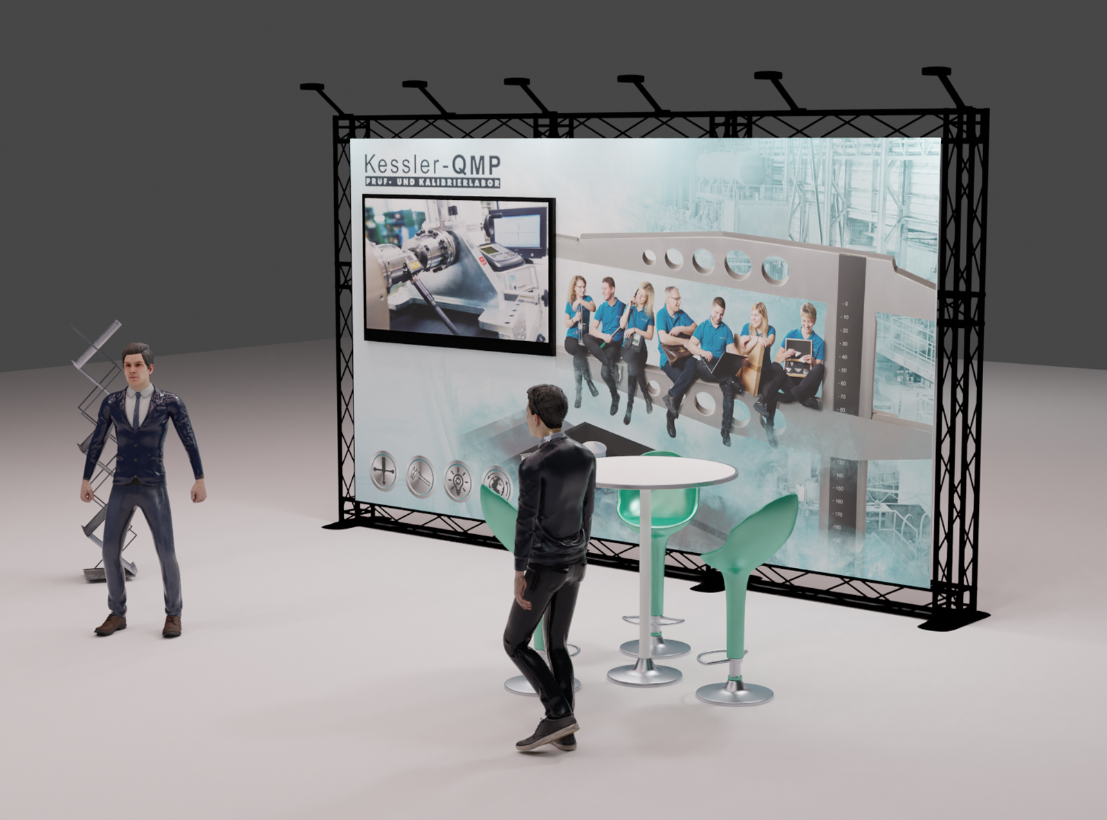 Die Kessler QMP GmbH ist seit 1998 als Kalibrierlabor tätig und bietet ihren Kunden eine breite Palette an Kalibrierungsleistungen für physikalische Größen an. Neben der Kalibrierung am Standort Friedewald und Offenburg besteht auch die Möglichkeit, Kalibrierungen im vollklimatisierten und akkreditierten mobilen Kalibrierlabor durchführen zu lassen. Um ihre Dienstleistungen zu bewerben und das Unternehmen auf Messen zu präsentieren, hat sich die Kessler QMP GmbH für die Neugestaltung ihres Messegerüsts entschieden.