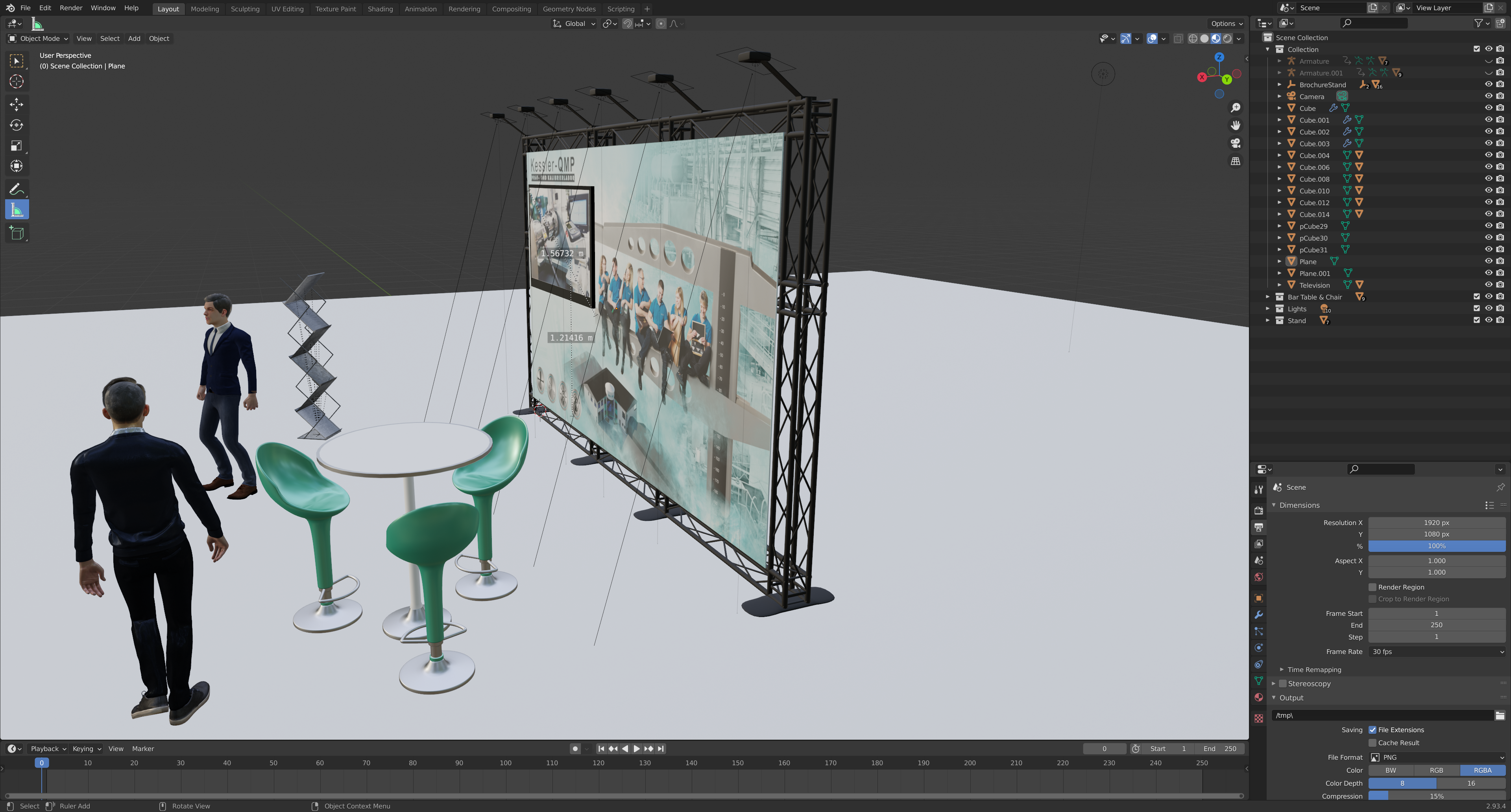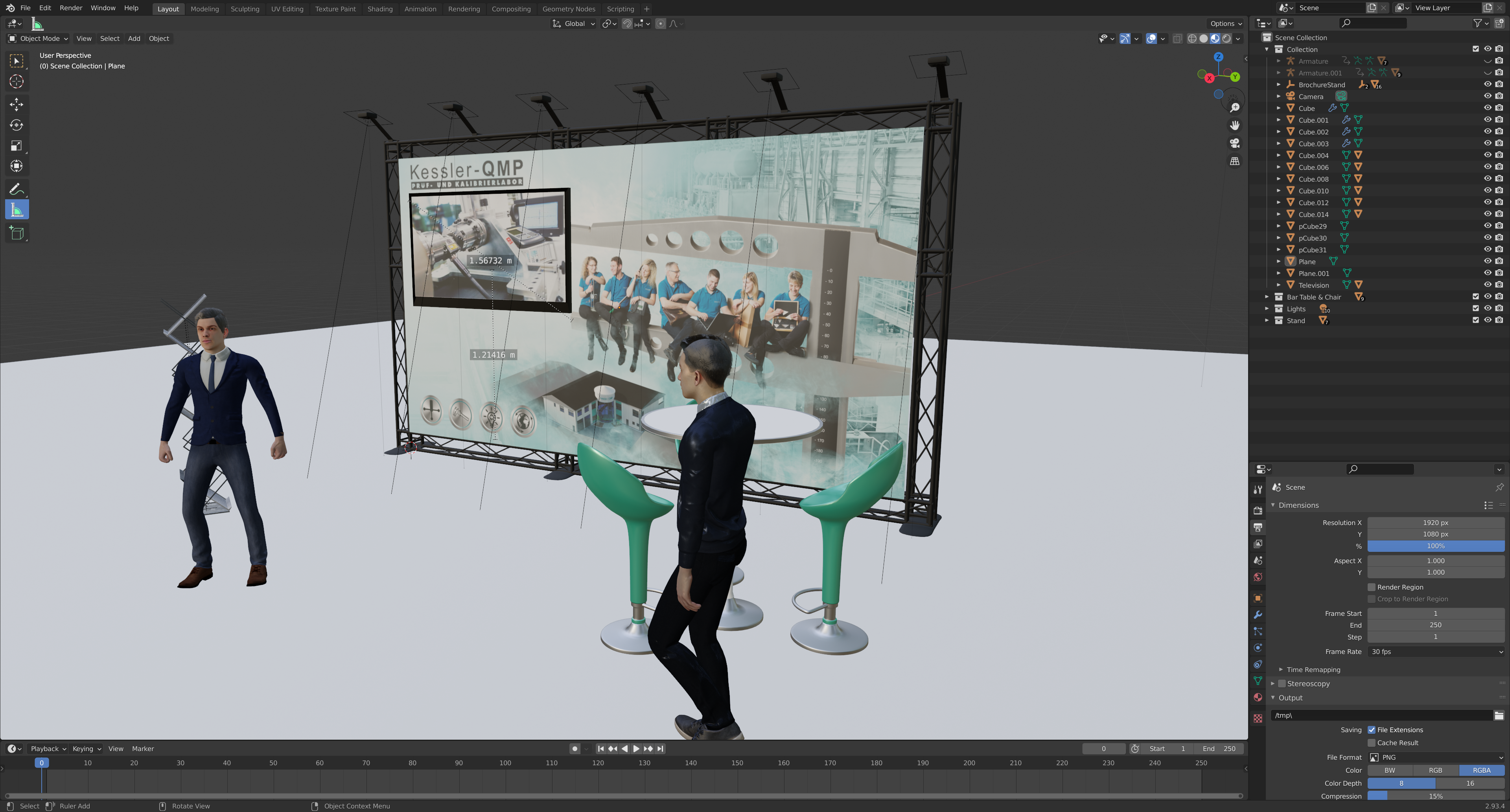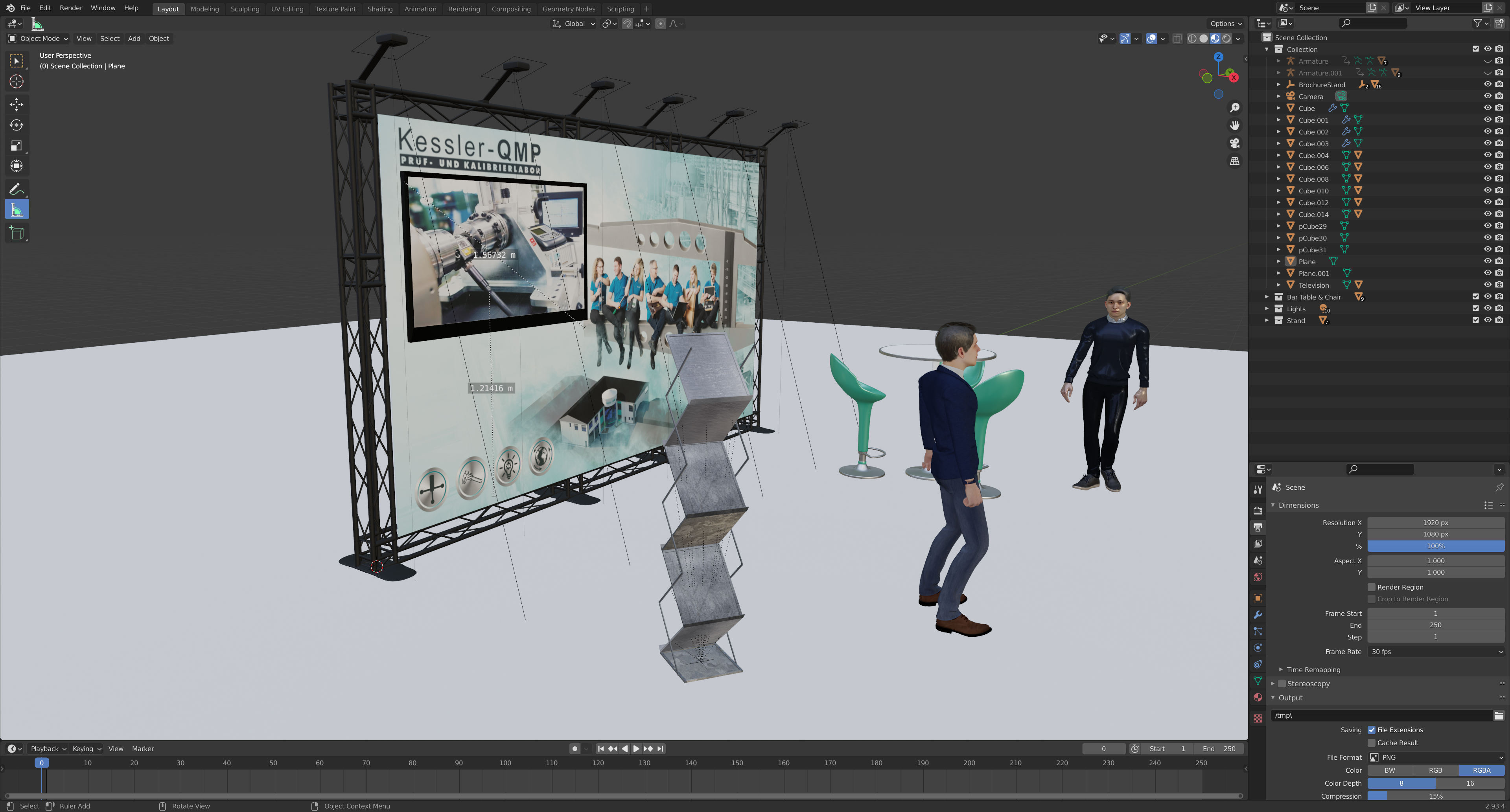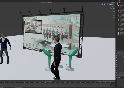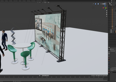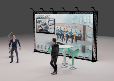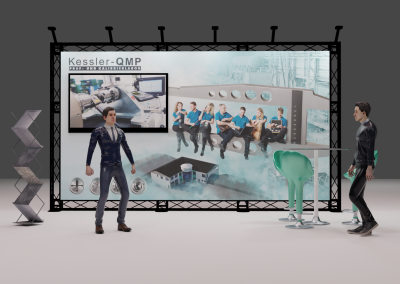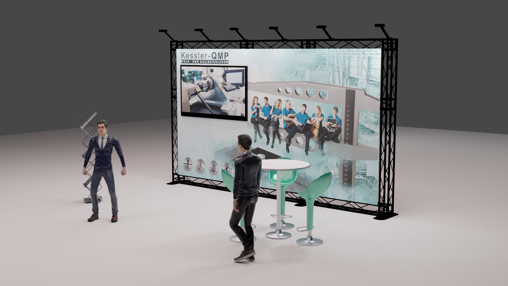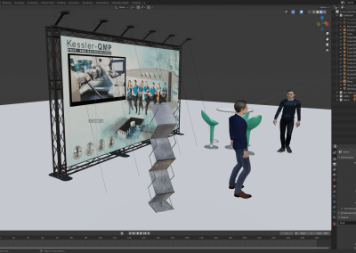 Die Aufgabe bestand darin, eine neue PVC-Plane für das bestehende Messegerüst der Kessler QMP GmbH zu designen. Besonderes Augenmerk sollte dabei auf dem am Gerüst befestigten Monitor liegen. Bevor die Druckdatei für die neue Plane erstellt werden konnte, wurde das Messegerüst in einem 3D-Programm maßstabsgetreu nachgebildet. Dies erlaubte eine realistische Planung und eine präzise Umsetzung der Gestaltungsideen.