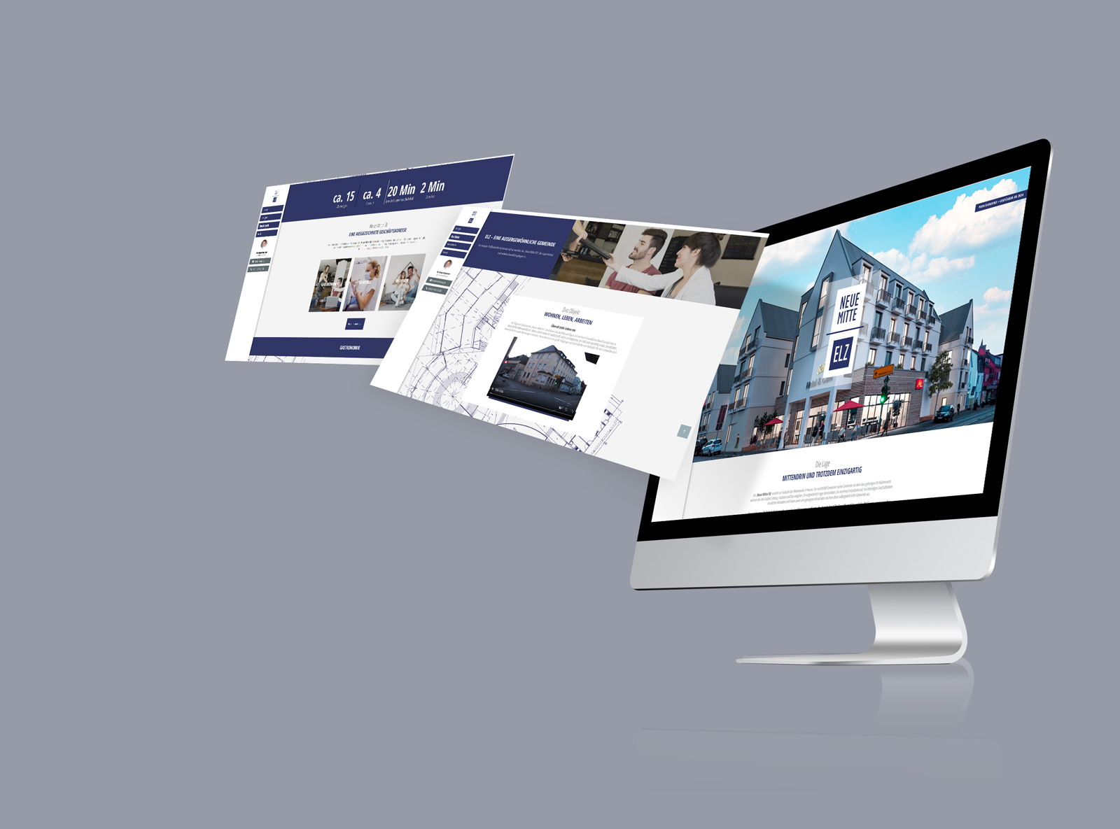Die Webseite der Neue Mitte Elz präsentiert sich im modernen und übersichtlichen Onepage-Stil. Auf einer einzigen Seite werden alle wichtigen Informationen zum Bauprojekt dargestellt. Hier findet der Besucher unter anderem Informationen zum Konzept, zu den geplanten Gewerbeflächen, zur Ausstattung der Wohnungen und zum Fortschritt des Bauprojekts. Auch ein Kontaktformular für Interessenten ist vorhanden.