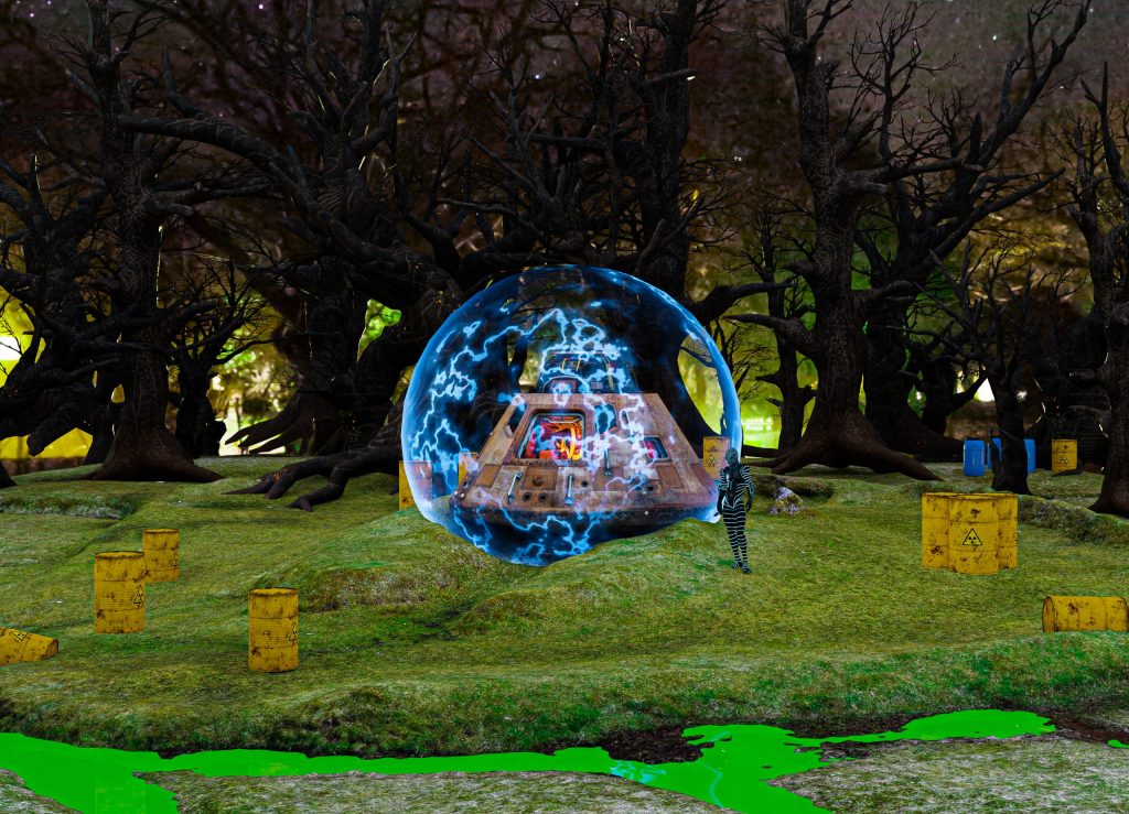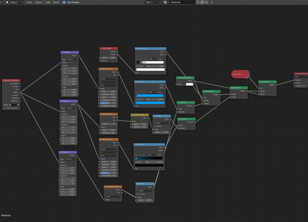 Manchmal entstehen Szenen ganz einfach beim ausprobieren. The Yunnenium Refinery entstand beim experimentieren mit Shading Nodes. Primäre Ziel war es, eine Art Energiekugeleffekt zu generieren. Aus der besagten Energiekugel wurde dann ein ganzes Setup, welches die Energiekugel als Shild für ein kleines Raumschiff darstellt. Der eigentliche Effekt ensteht durch das kombinieren und multiplizieren von 4 verschiedenen Prozeduralen Texturen.